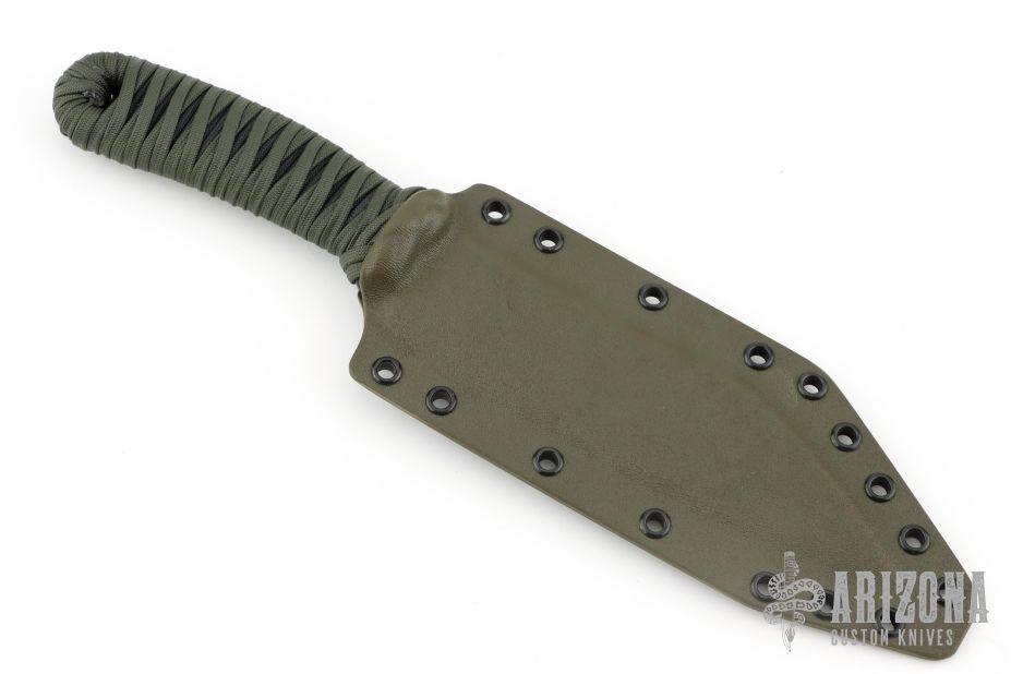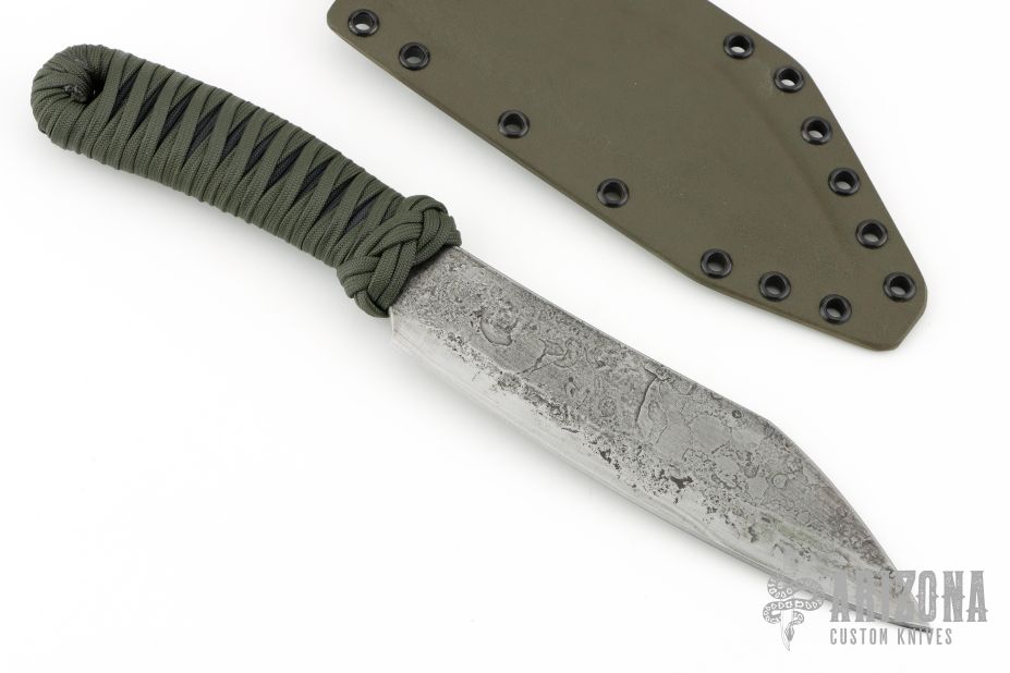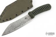 This knife by James Helm features a hand forged blade, .135" blade stock and 1.708" blade depth, hidden tang construction. The handle has a paracord wrap that has been epoxied. Comes with a kydex sheath set up for TekLok. New from Maker!