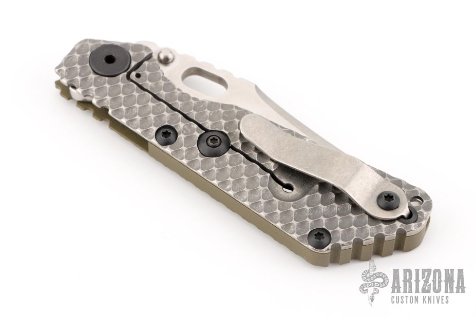 This SNG DGG by Strider has a satin/stonewash finished bowie blade with dual thumb studs, thumb hole, and notched thumb rest. Handle has a G10 cover, bead blasted titanium "Gunner Grip", lockbar stabilizer, and titanium tip up clip. Nice detent, lockup and blade seating.  Excellent Conditon.  Reground by Danny Yard.