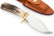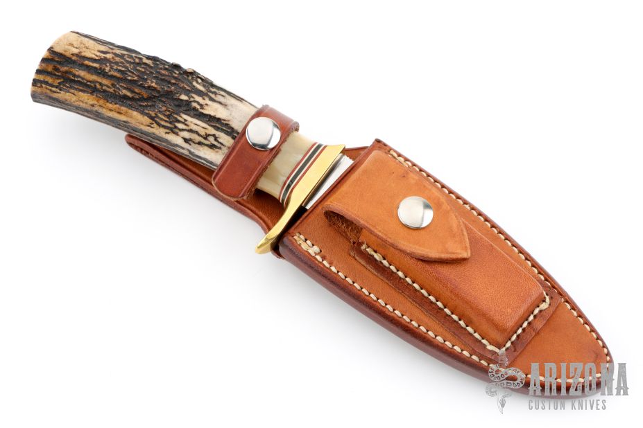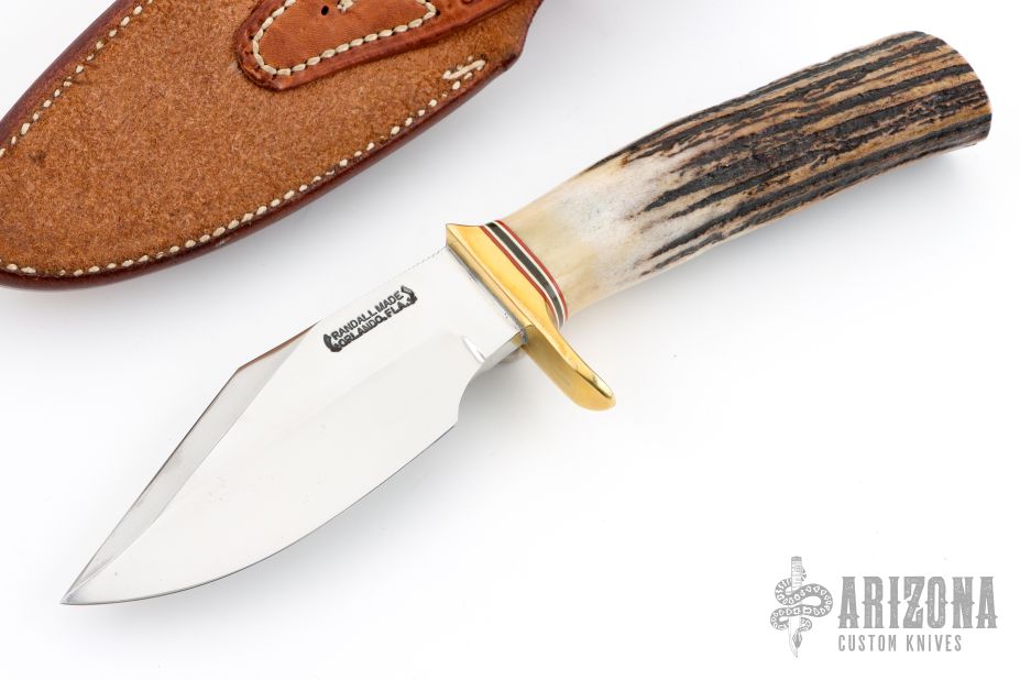 This Model 19-4.5 Bushmaster by Randall Made Knives features a satin finished clip point blade with sharpened top edge and notched thumbrest, .210" blade stock and 1.703" blade depth, hidden tang construction. The handle is comprised of a brass guard, red/white/blue spacers and a stag grip. Includes a brown leather rough back leather sheath with belt loop and honing stone. Excellent condition.
