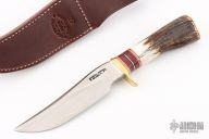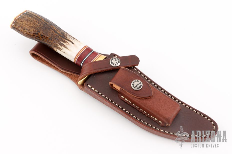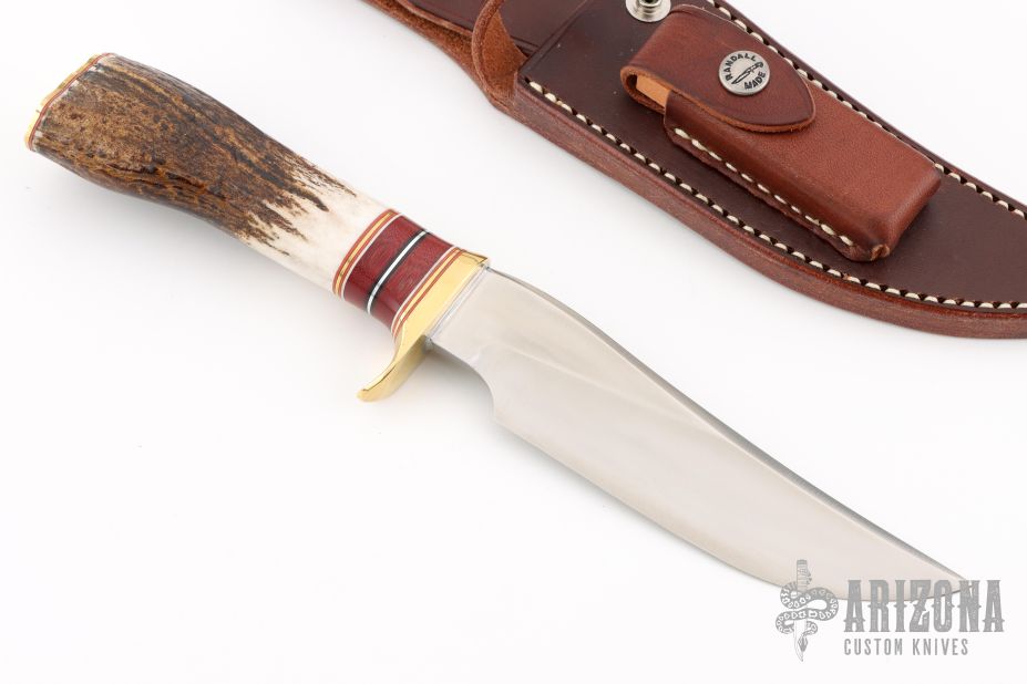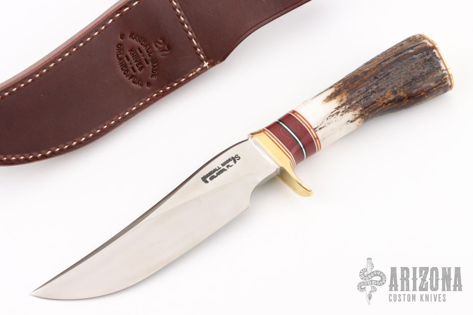 The Model 27 is an ideal all-around heavy-duty sportsman's knife. This knife has a satin finished blade with .233" blade stock and 1.412" blade depth, hidden tang construction. The handle has a brass guard and butt, stag grip with red/brass/white/red linen micarta/black/duralumin spacers. Comes with a brown leather sheath. Excellent condition.