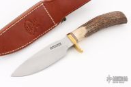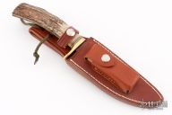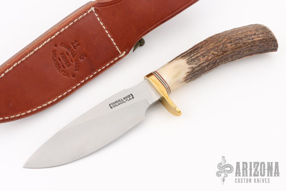The Model 11 is the original drop-point blade. Designed by Tommy Thompson, noted Alaskan guide, in 1952 for big-game skinning, with point dropped below top of blade to prevent cutting too deeply through skins when used point first. The blade is satin finished with a notched thumbrest, .204" blade stock and 1.332" blade depth, hidden tang construction. The handle has a brass guard, stag grip, red/white/blue spacers. Comes with a brown leather sheath. Excellent condition.