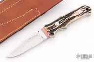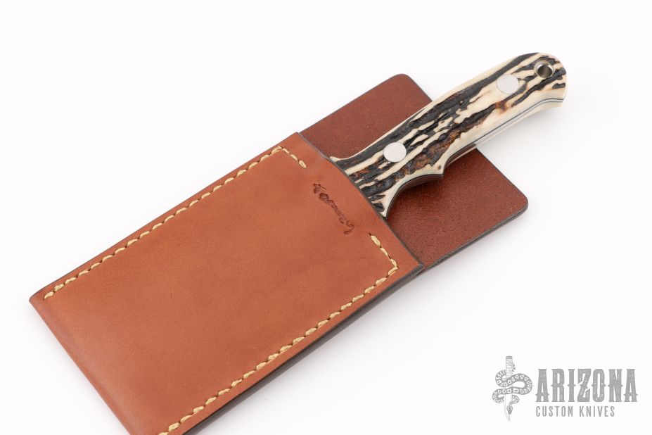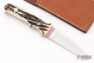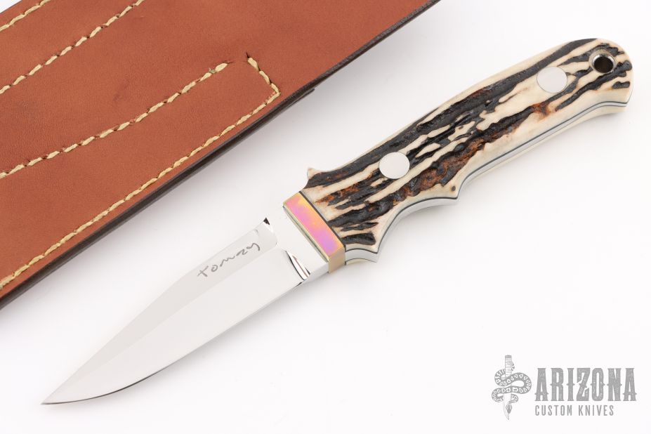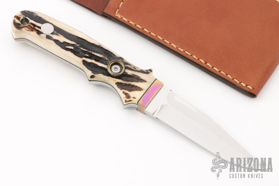 3.2” Highly Mirror Polished and Finished, Solid ATS-34 Spear Point Stainless Steel Blade. This Full-Tang, Fighter knife is fitted with selected high quality Samber Stag Handle w/ Anodized Natural Rainbow Color Titanium Hilt.