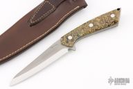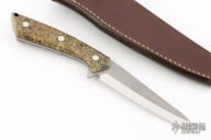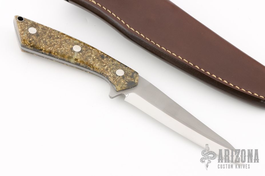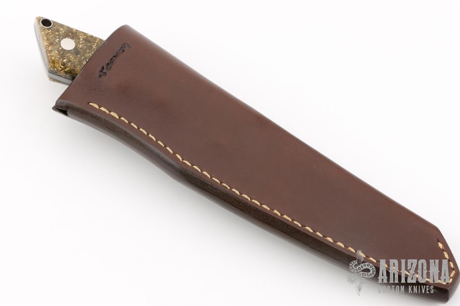 4.6” Solid CPM-440V Drop Point Steel Blade. The upper half of the blade features a matte finish with a subtle aesthetic, while the lower half is polished to a mirror finish with a convex blade grind. This Full-Tang knife is fitted with an impressive art of 4.8” Mr. Arakawa's original handmade Custom "Golden Spiral" Hybrid Resin Handle that has Good Weight and Durability.