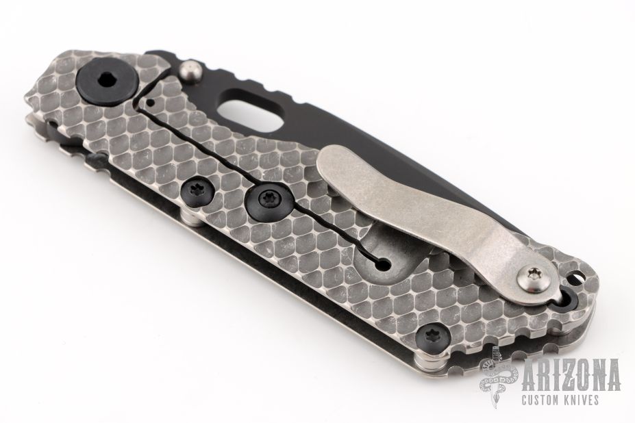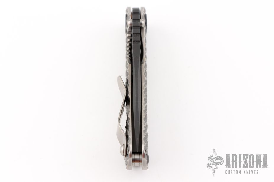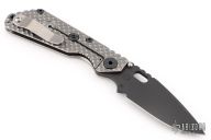 This SNG DGG by Strider has a black spear point blade with dual thumb studs, thumb hole, and notched thumb rest. Handle is titanium with "Gunner Grip" texture, lockbar stabilizer, and stonewash finished titanium tip up clip. Nice detent, lockup and blade seating. Excellent condition.