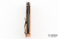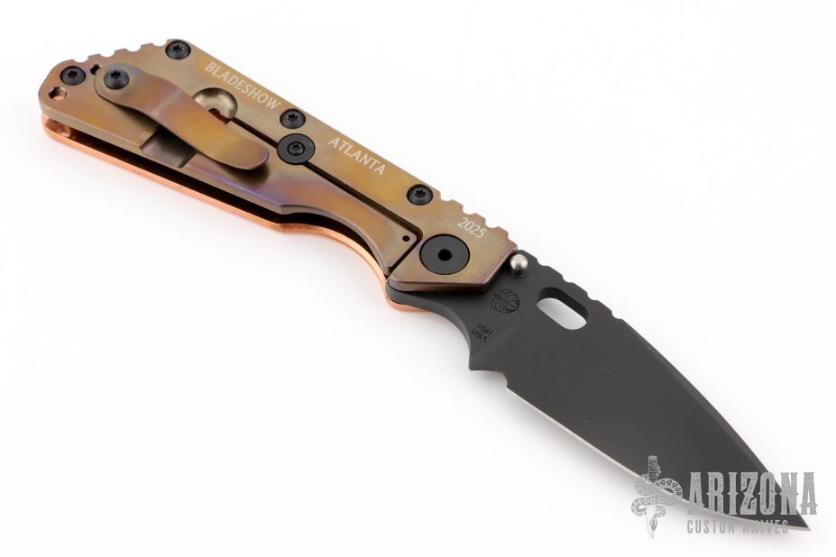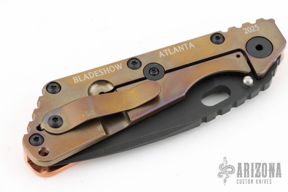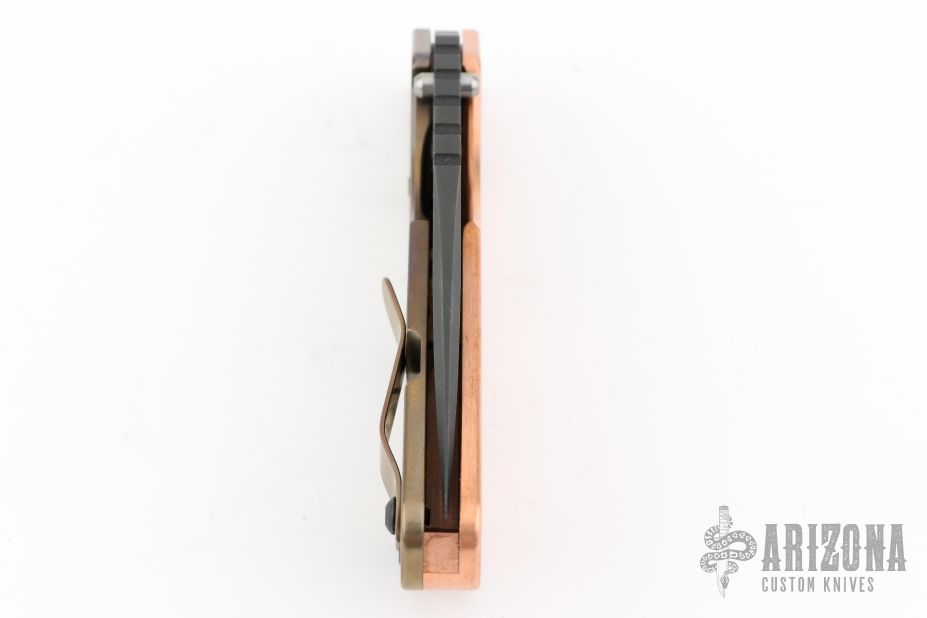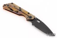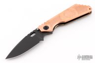This Mick Strider SMF framelock folder features a black finished spear point blade with thumbhole and notched thumbrest. The handle has a copper and orange peel finished anodized titanium frame with titanium clip, tip up carry. Jimping on blade spine. Includes Hinderer "Lock Bar Stabilizer" for maximum reverse lock retention. Nice detent, lockup and blade seating. Excellent condition.