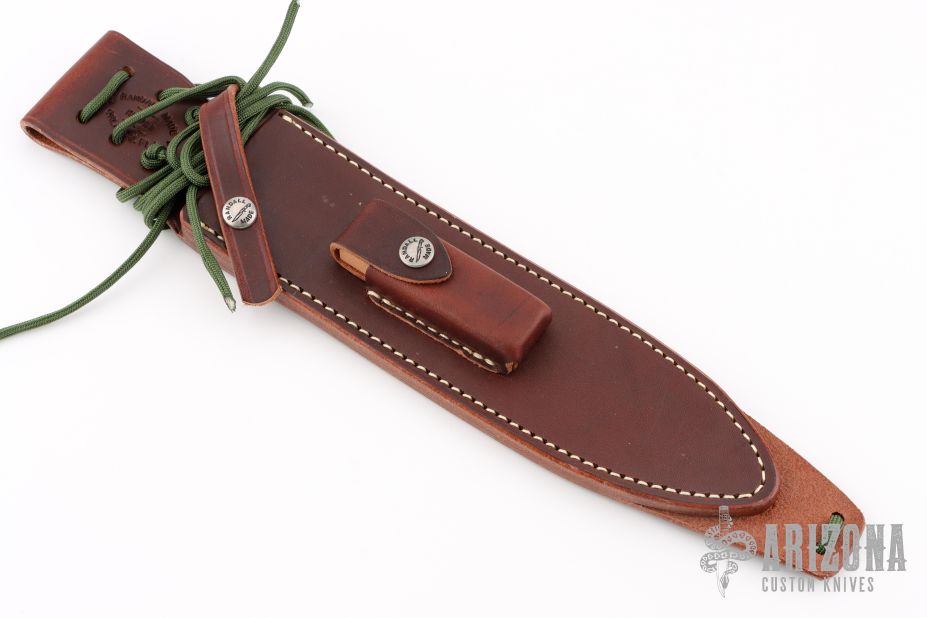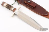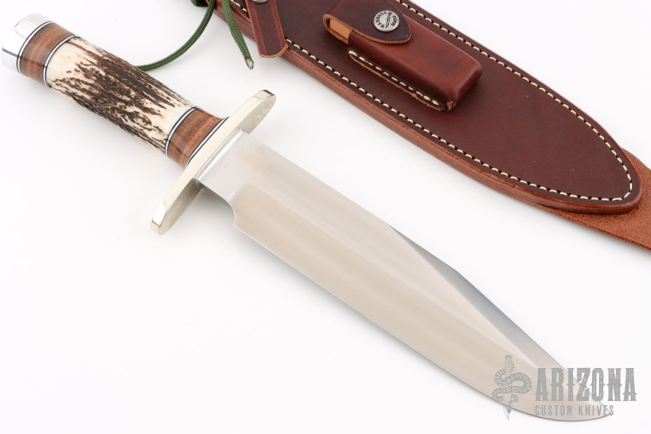 The Model 12 was made to meet the demand for a heavy-duty sporting knife of the Bowie type. This non-catalog version has a Model 14 grind. This knife has a 9" blade with sharpened top edge, .226" blade stock and 1.817" blade depth, hidden tang construction. The handle has a forward curved nickel silver guard and duralumin butt, stag grip with black/duralumin/stacked leather spacers. Includes a brown leather sheath and original paper wrapping. New from maker.