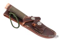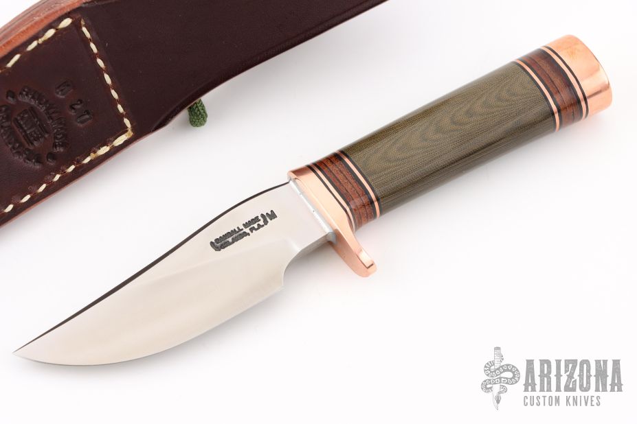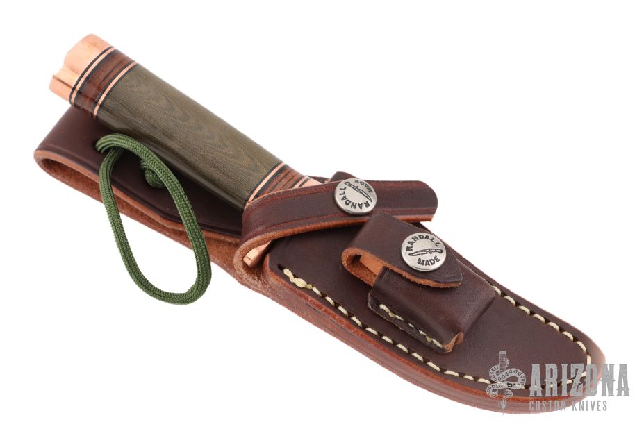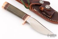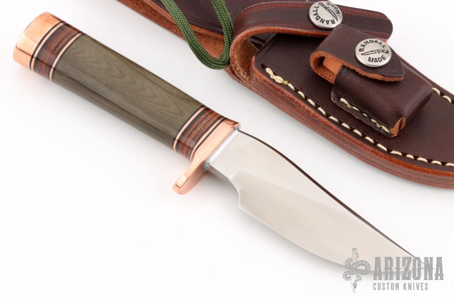The miniature Model 27 debuted in Randall's 2012 75th anniversary catalog and is the first catalog miniature model. This knife has a 3.5" stainless steel blade, .181" blade stock and 1.086" blade depth, hidden tang construction. The handle has a copper guard and butt, green micarta grip, and black/copper/leather spacer pattern. It comes with a brown leather sheath and original paper wrapping. New from maker!
