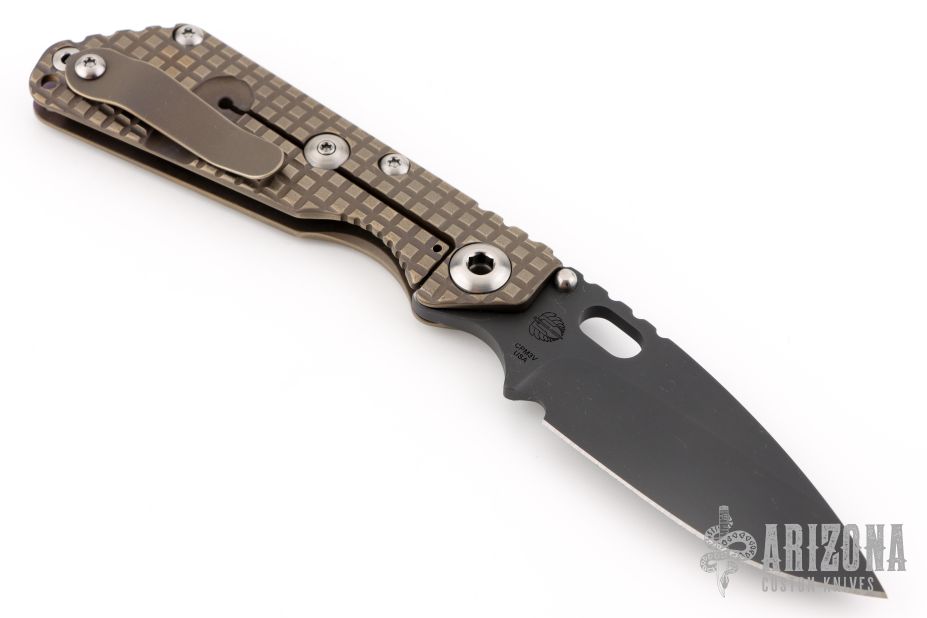 This MS SNG framelock folder by Mick Strider features a black blade and a MEFP bronze titanium frame and tip up titanium clip. Includes Hinderer "Lock Bar Stabilizer" for maximum reverse lock retention. Nice detent, lockup and blade seating. Excellent condition.
