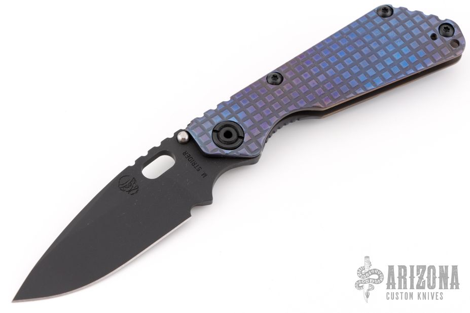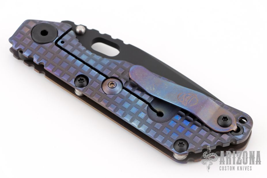 This MS SNG framelock folder by Mick Strider features a black blade and a MEFP blurple titanium frame and tip up titanium clip. Includes Hinderer "Lock Bar Stabilizer" for maximum reverse lock retention. Nice detent, lockup and blade seating. Excellent condition.