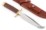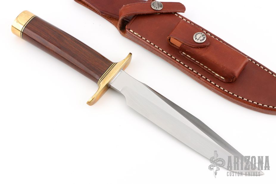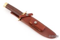 The Model 1 was made famous by Allied combat troops in World War II and has since been widely used in all theaters of war. It has a satin finished blade with sharpened top edge, .199" blade stock and 1.225" blade depth, hidden tang construction. The handle has a brass guard and butt, desert ironwood grip with black/brass spacers. Includes a brown leather sheath. Excellent condition.