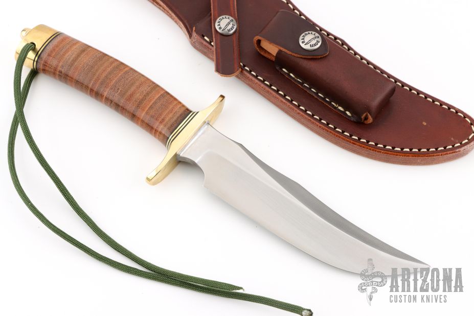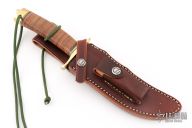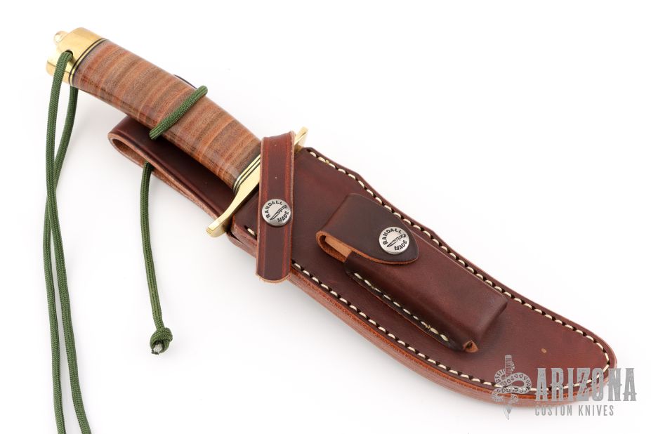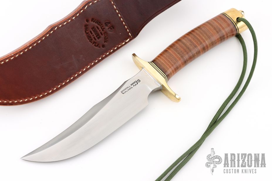 This Model 4-6F by Randall Made Knives features a satin finished blade with sharpened top edge, .232" blade stock and 1.368" blade depth, hidden tang construction. The handle has a brass double guard, black/brass spacers, stacked leather grip and brass butt cap with lanyard hole. Comes with a brown leather sheath. New from maker!