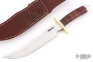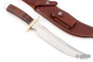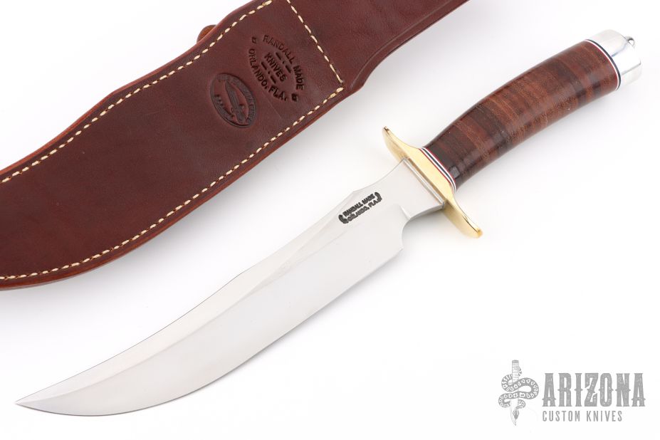 The RKS4 is the fourth club knife made by Randall Knives for the Randall Knife Society. The blade is etched "RKS 952/1038". Carbon steel blade with sharpened top edge, .218" blade stock and 1.414" blade depth, hidden tang construction. The handle has brass guard, stacked leather handle with red, white and blue spacers, and a duralumin butt. Comes with a brown leather sheath. Has a couple light scratches, otherwise excellent condition.