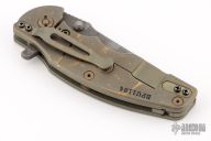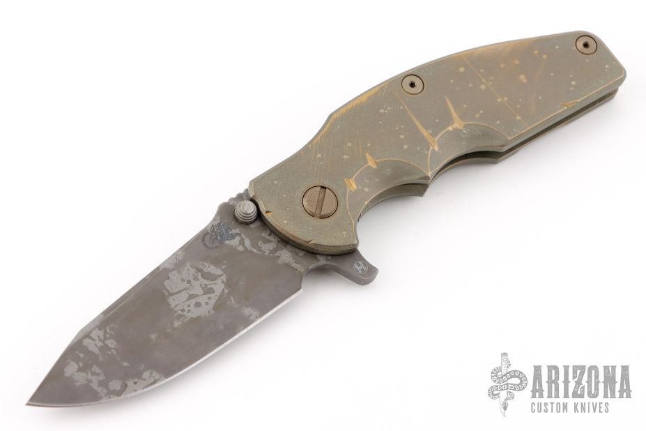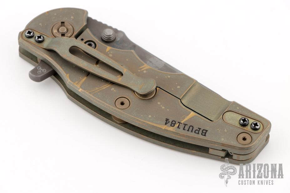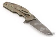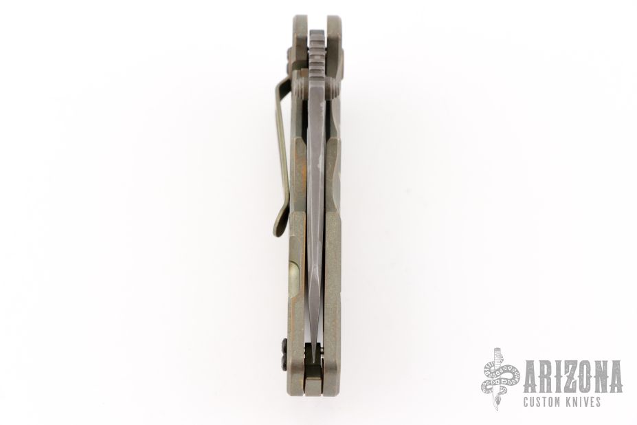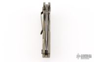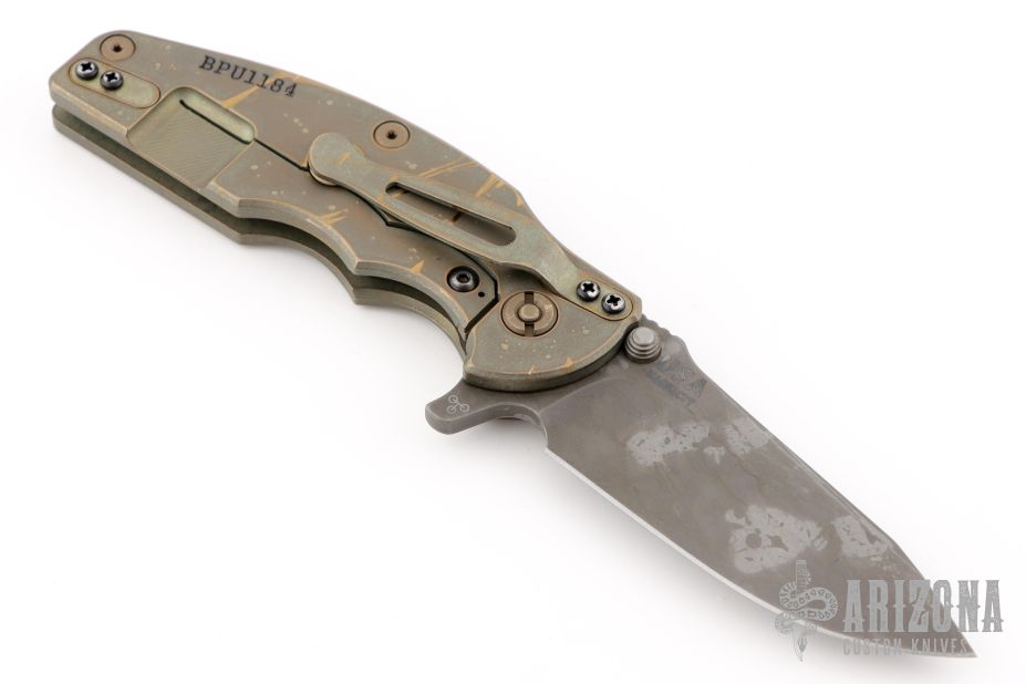 This Jurassic by Hinderer Knives features a clip point blade with notched thumbrest and flipper. The handle has a distressed titanium frame with a tip up or down reversible clip and a modular backspacer. Nice detent, lockup and blade seating. This knife has the Tri-Way pivot system. Comes with original box and extra washers. Excellent condition. #1184
