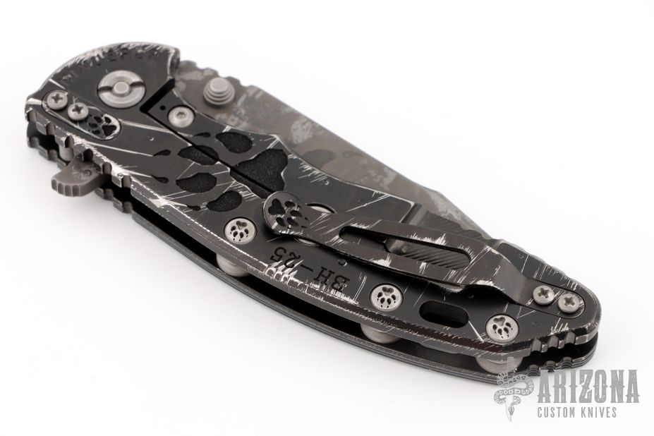 This Battle Hound XM-18 3.5" flipper by Rick Hinderer features a stonewashed DLC blade with notched thumbrest and flipper. The handle has a distressed titanium frame with a tip up or down reversible titanium clip and filler tab, lanyard hole at the butt. Comes with original box and extra washers. Excellent condition.