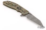 This Skinny Battle Hound XM-24 by Hinderer Knives features a distressed wharncliffe blade with notched thumbrest and flipper. The handle has a textured G-10 scale with tumbled titanium liner and frame, tip up or down reversible titanium clip. Comes with original box, cards, and extra washers. Excellent condition. #25