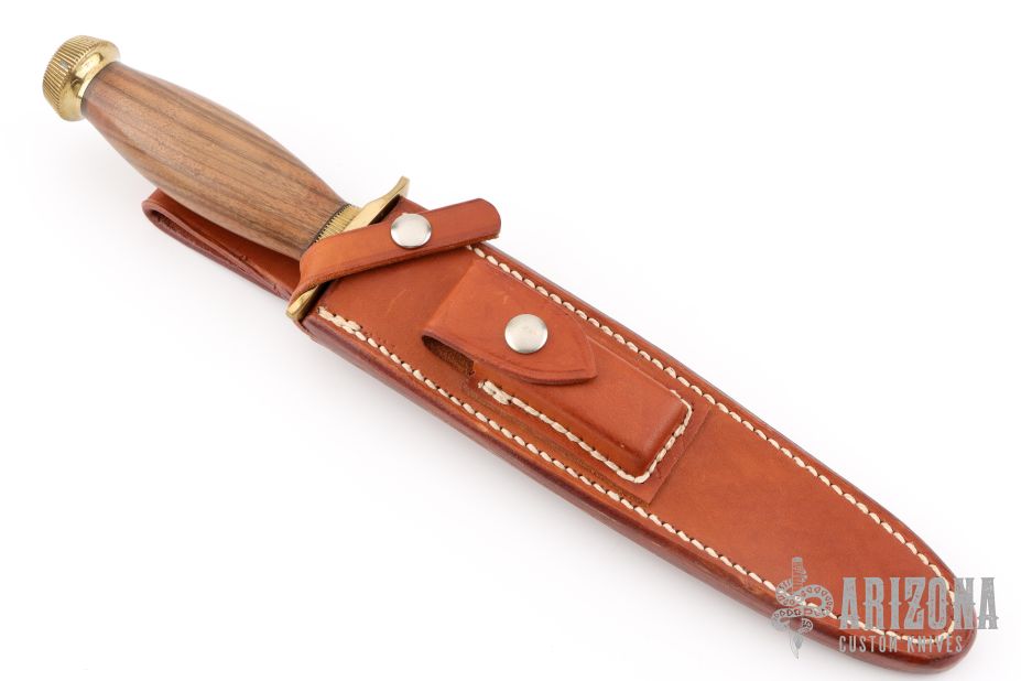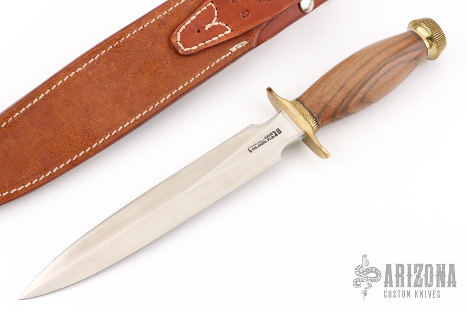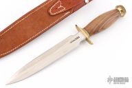 The Model 2-7 by Randall Made Knives is a heavily made dagger or dirk. Brass guard with scalloped collar, walnut handle, brass scalloped butt cap, black spacers. Double edged satin finished blade, .226" blade stock and 1.299" blade depth, hidden tang construction. Comes with a Johnson Roughback brown leather sheath. Excellent condition.