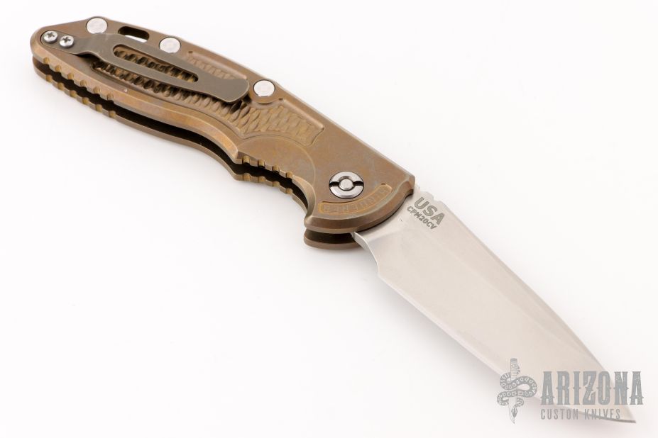 This XM-18 Flipper by Rick Hinderer Knives features a 3.5" stonewashed finish blade, notched thumbrest and flipper. The handle has a stonewashed and anodized titanium frame with a matching tip up pocket clip. Excellent condition.
