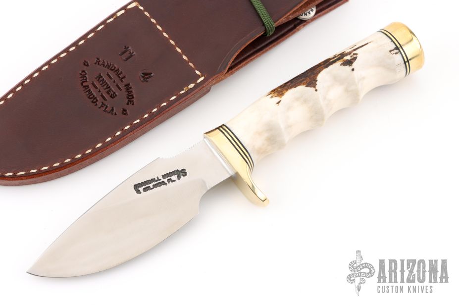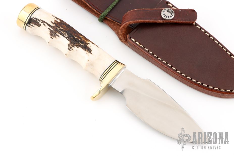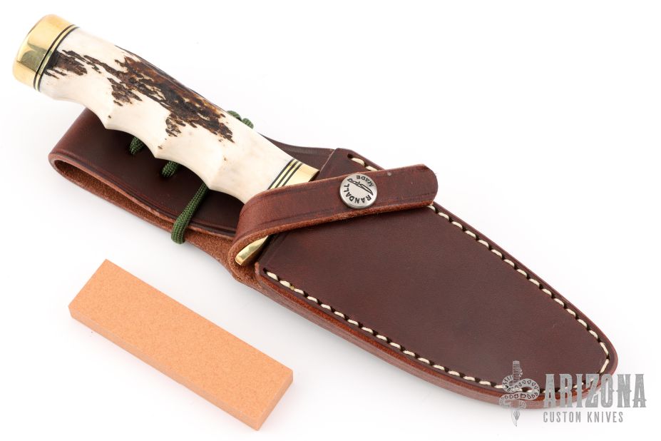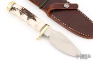 The Model 11 is the original drop-point blade. Designed by Tommy Thompson, noted Alaskan guide, in 1952 for big-game skinning, with point dropped below top of blade to prevent cutting too deeply through skins when used point first. This knife has a satin finished blade with notched thumbrest, .167" blade stock and 1.320" blade depth, hidden tang construction. The handle has a brass guard and butt, finger groove stag grip with black/brass spacers. Comes with a brown leather sheath and origianl paper wrapping. New from maker!