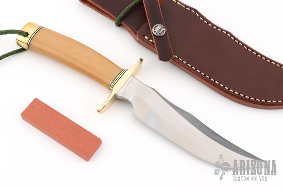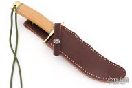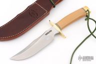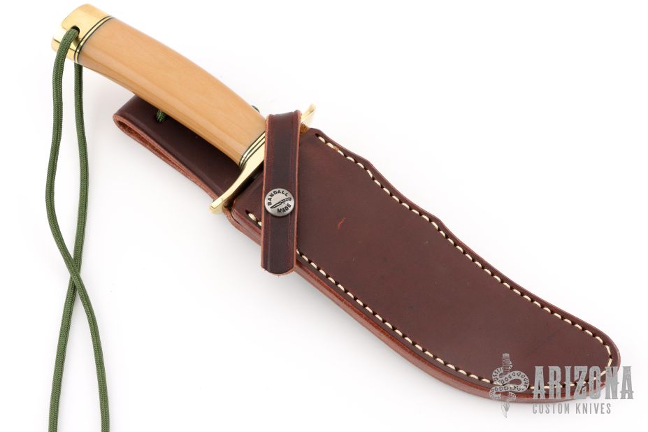 This Model 4-6F by Randall Made Knives features a satin finished blade with sharpened top edge, .212" blade stock and 1.375" blade depth, hidden tang construction. The handle has a brass double guard, black/brass spacers, bone linen micarta grip and brass butt cap with lanyard hole. Comes with a brown leather sheath and original paper wrapping. New from maker!