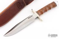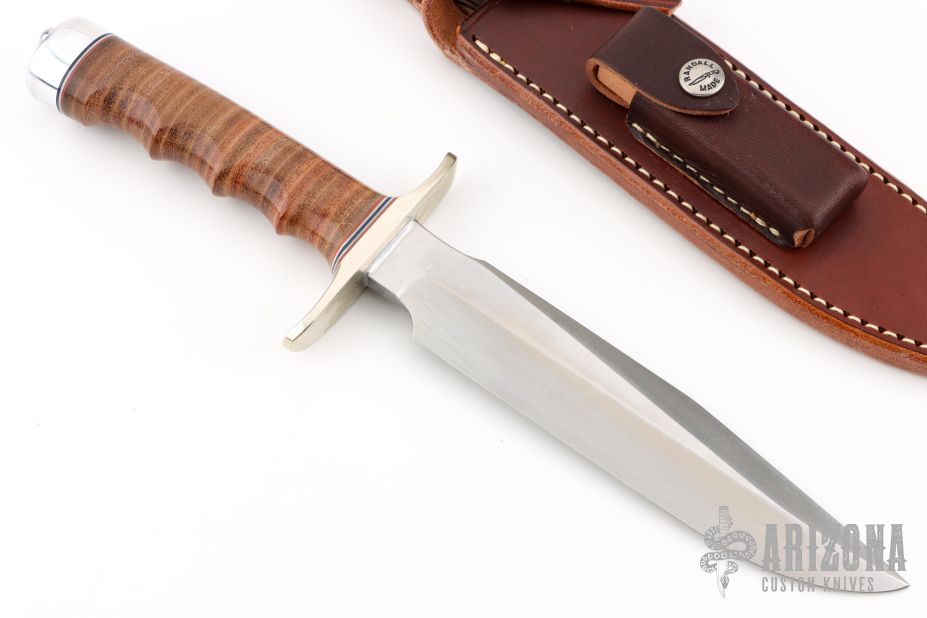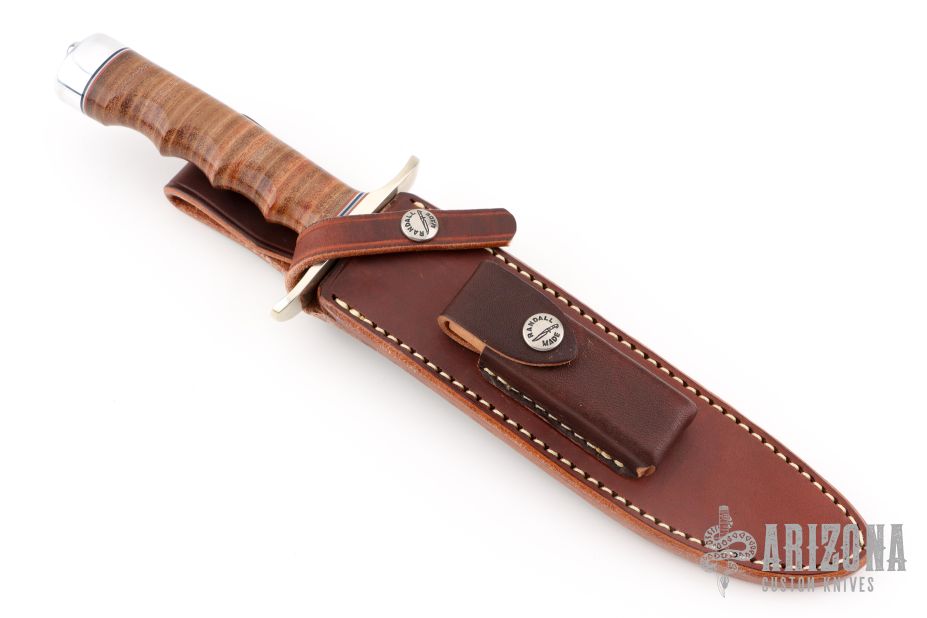 "The Model 1 by Randall Made Knives was made famous by Allied combat troops in World War II and has since been widely used in all theaters of war." This knife features a satin finished blade with a sharpened top edge, .250" blade stock and 1.301" blade depth, hidden tang construction. Nickel silver guard, finger groove stacked leather handle with red/white/blue spacers, and a duralumin butt cap. Includes a brown leather sheath and original paper wrapping. New from maker!