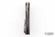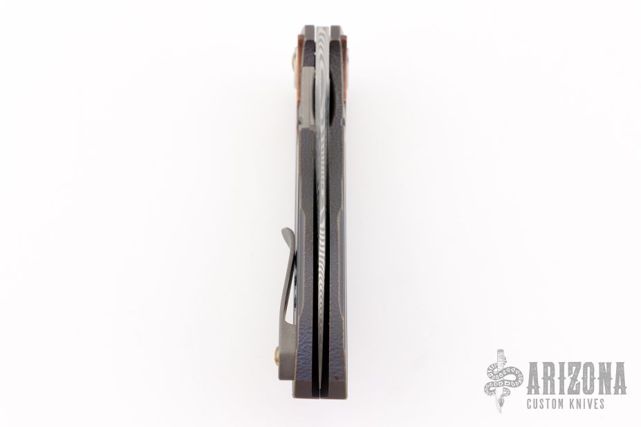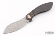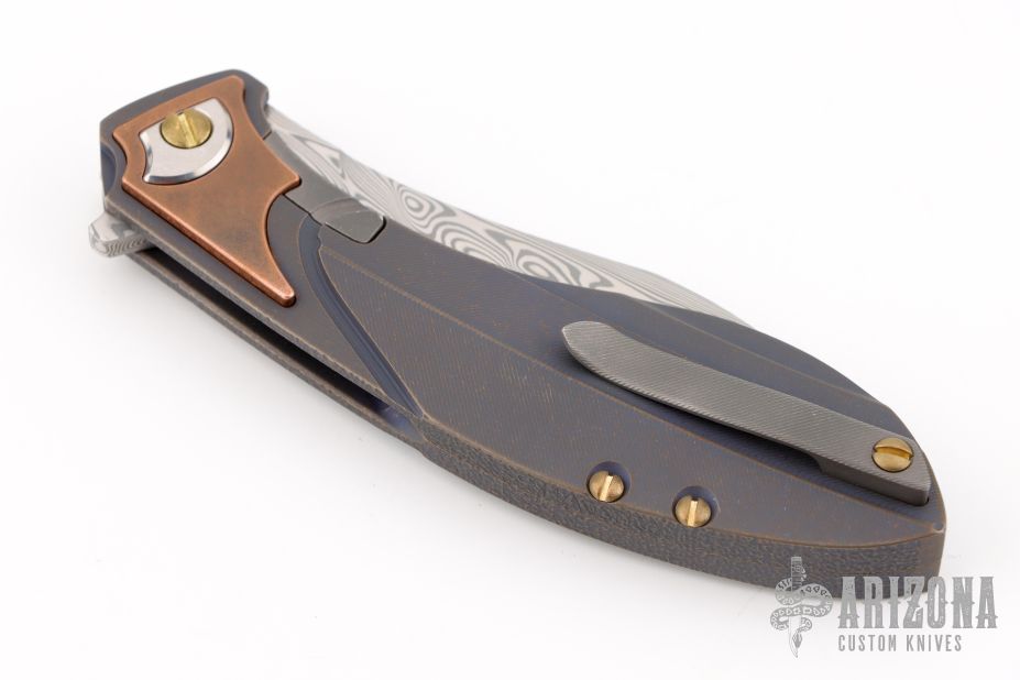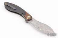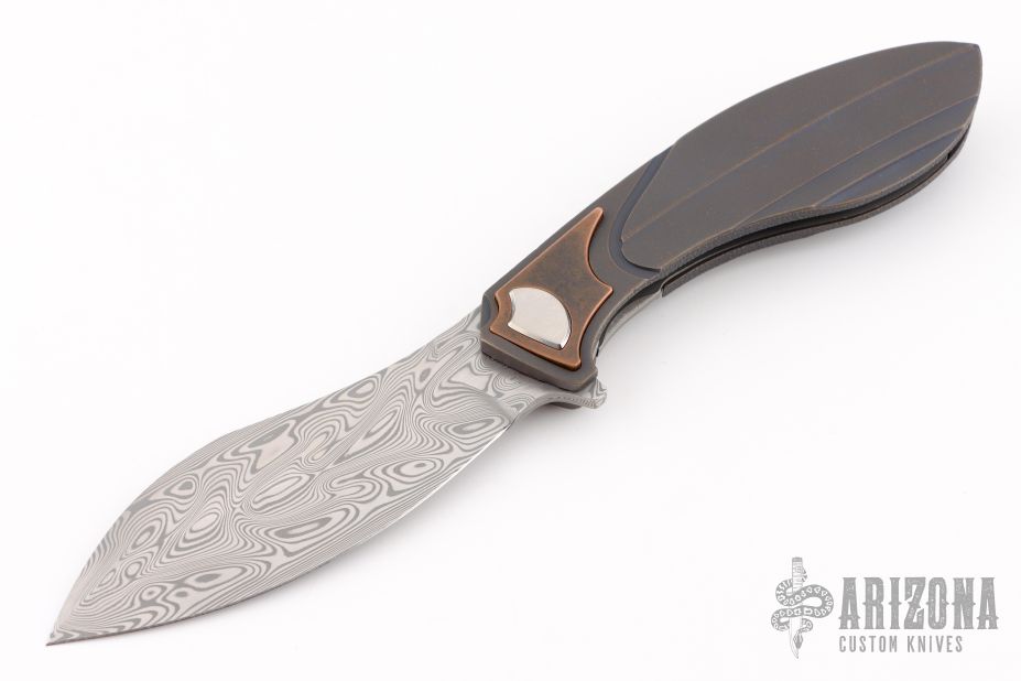 This Albatros Flipper by Daniel Dunaway-Knight and Anders Hogstrom features an unswept Damasteel blade with flipper tab. The handle has an anodized and textured titanium frame with a copper inlaid bolster and unique pivot. The lockbar is inlaid, has a lockface insert, and a tip up titanium clip. Nice action, detent, and blade seating. Comes with a zippered case. New from maker!