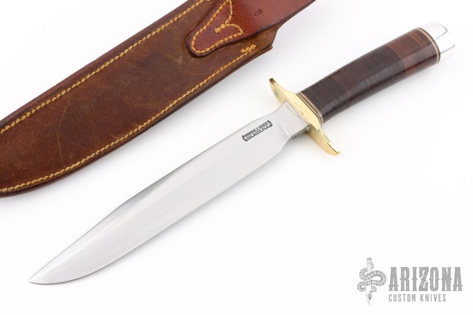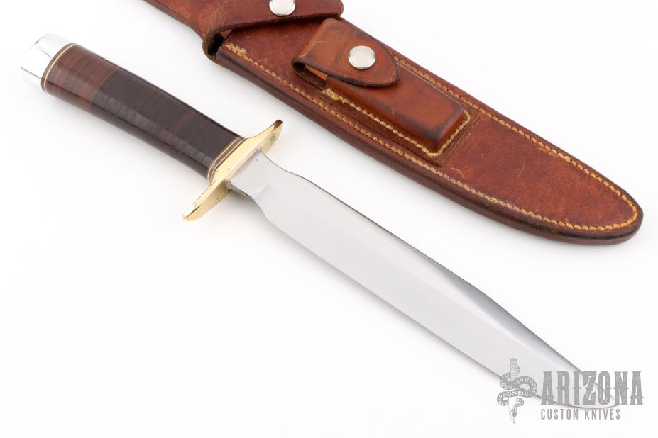 "The Model 1 by Randall Made Knives was made famous by Allied combat troops in World War II and has since been widely used in all theaters of war." This knife features a satin finished blade with a sharpened top edge, .236" blade stock and 1.210" blade depth, hidden tang construction. The handle has a brass guard, stacked leather handle with red/white/blue spacers, and a duralumin butt cap. Includes a rough back brown leather sheath. Has some scratches, otherwise excellent condition for its age.