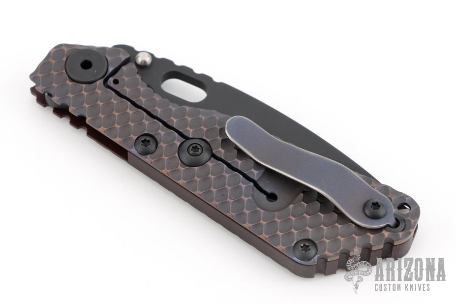 This SNG DGG by M Strider has a black drop point blade with dual thumb studs, thumbhole, and notched thumbrest. Handle is black G-10 and antiqued anodized titanium "Gunner Grip", lockbar stabilizer, and titanium tip up clip. Nice detent, lockup and blade seating. Excellent condition.