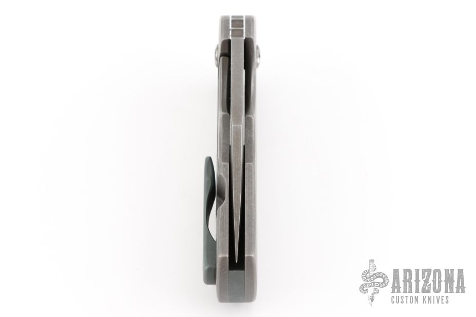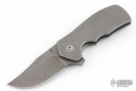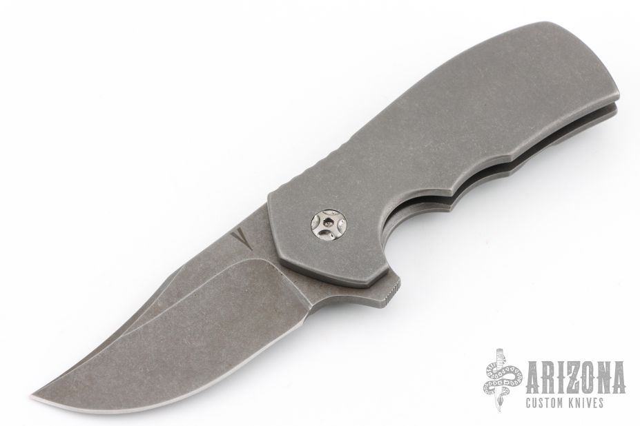 This Ace Flipper by Jeff VanderMeulen features a stonewash finished blade with a notched flipper, .167" blade stock. Tumble finished titanium frame with matching backspacer and tip up clip with hidden screws. Has nice blade seating, lockup and detent. Rides on bearings. Dated 7/2023 and #8 inside frame. Comes in a zippered case and COA. New from maker!