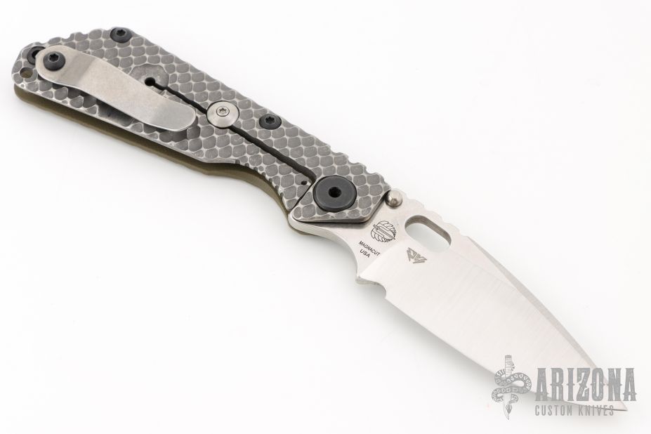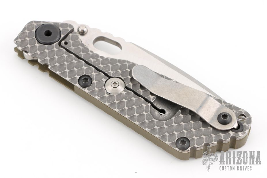 This SNG DGG by Strider has a satin/stonewash finished bowie blade with dual thumb studs, thumb hole, and notched thumb rest. Handle has a G10 cover, bead blasted titanium "Gunner Grip", lockbar stabilizer, and titanium tip up clip. Nice detent, lockup and blade seating.  Excellent Conditon.  Reground by Danny Yard.