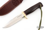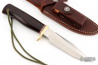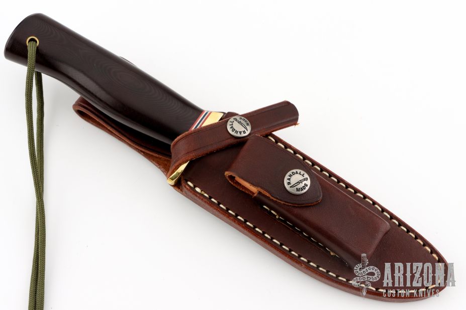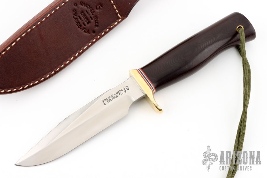 The Model 1-5 by Randall Made Knives has a brass guard, maroon linen micarta grip with red/white/blue spacers. Satin finished blade with sharpened top edge, .222" blade stock and 1.094" blade depth, hidden tang construction. Comes with a brown leather sheath. New from maker.