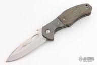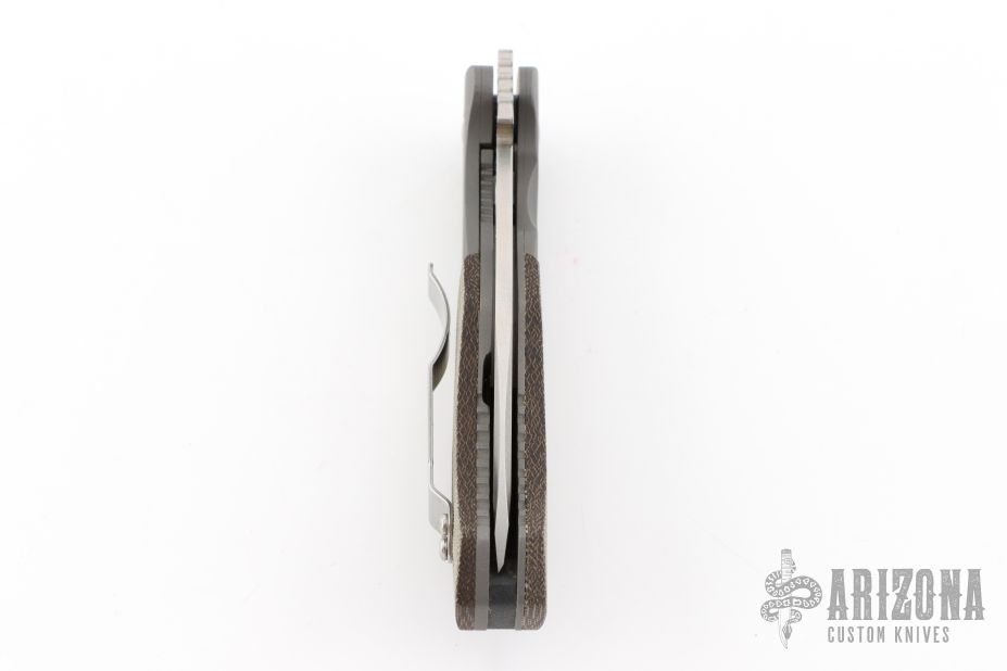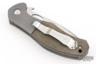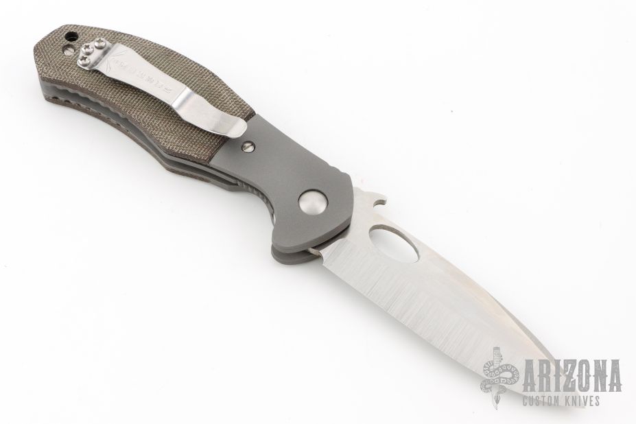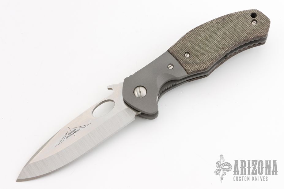 This custom CQC-10 by Ernie Emerson features a hand-ground satin finish blade, dovetailed bead blast titanium bolsters and liners, green canvas micarta scales, black G-10 backspacer, and tip up stainless steel clip. Thumbhole and Wave feature. Comes in original box. New from maker at the 2025 Blade Show!