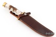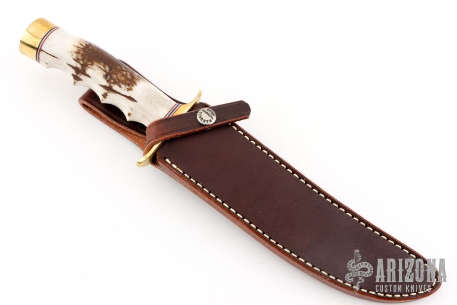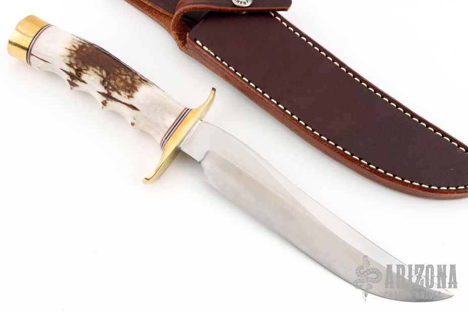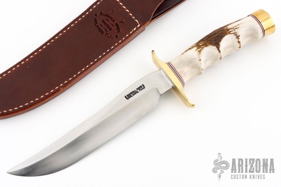 This Model 3-7 Recon Style Fighter by Randall Made Knives features a satin finished blade with a sharpened top edge, .210" blade stock and 1.249" blade depth, hidden tang construction. The handle has brass double guard, finger groove stag grip, red/white/blue spacers, brass butt. Comes with a brown leather sheath. New condition.