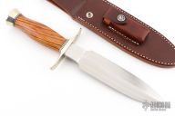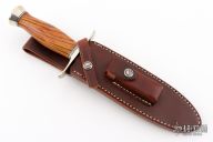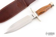 This Tom Clinton Special by Randall Made Knives has a double-edged stainless steel satin finished blade, .229" blade stock and 1.544" blade depth, hidden tang construction. The handle has a nickel silver guard and butt, wood grip, nickel silver butt, black and duralumin spacers. Comes with a brown leather sheath. New condition.