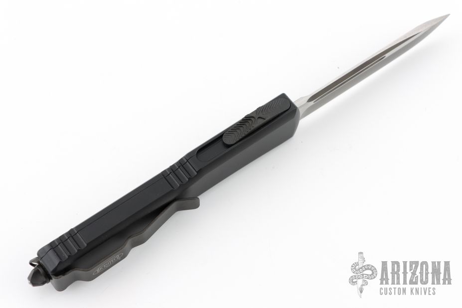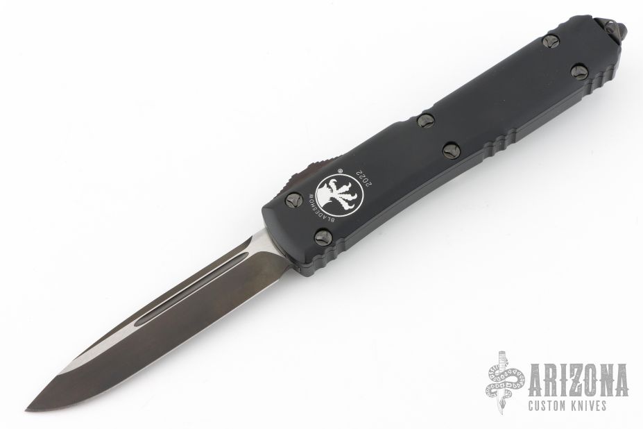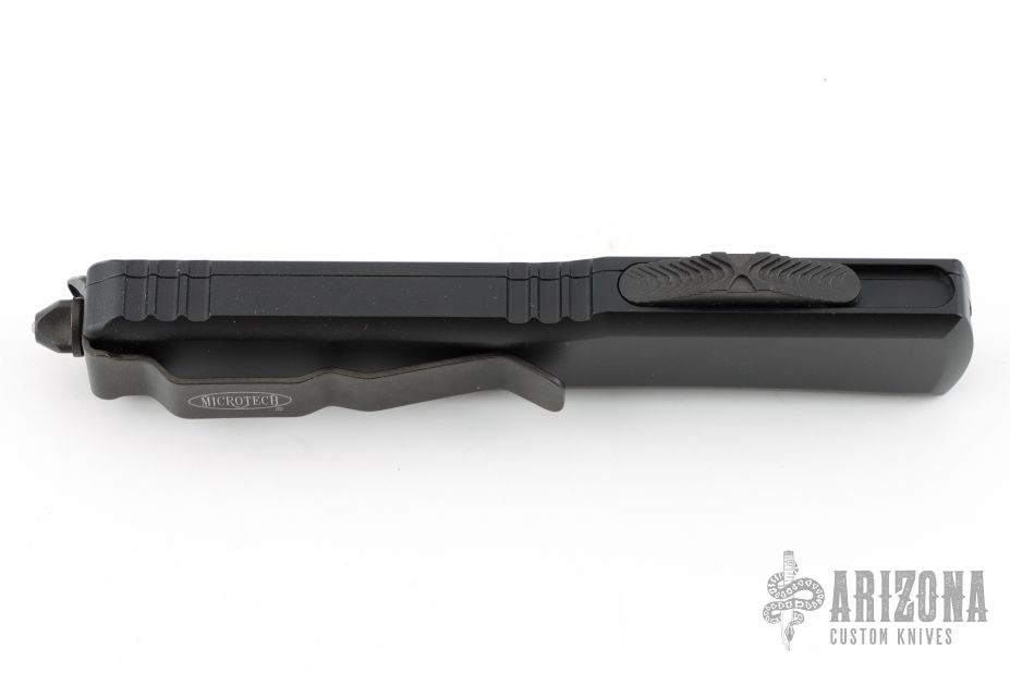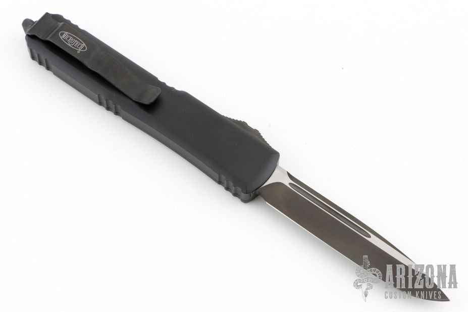 This Ultratech OTF automatic by Microtech features a S/E DLC stonewash finished blade with a standard edge. Black aluminum frame with black hardware and stainless steel clip. Glass breaker. Comes with original box and papers. Has a couple light scuffs and scratches, great condition otherwise.