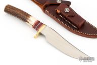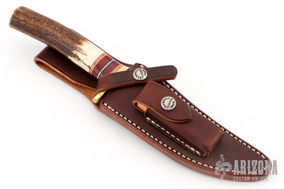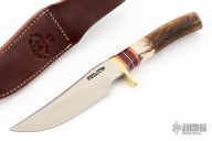 The Model 27 is an ideal all-around heavy-duty sportsman's knife. This knife has a satin finished blade, .231" blade stock and 1.408" blade depth, hidden tang construction. The handle has a brass guard, and stag grip with red/brass/white/red linen micarta/duralumin spacers, brass butt plate. Includes original brown leather sheath. New condition.