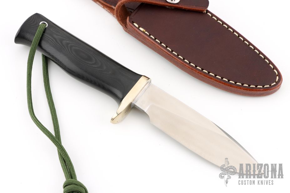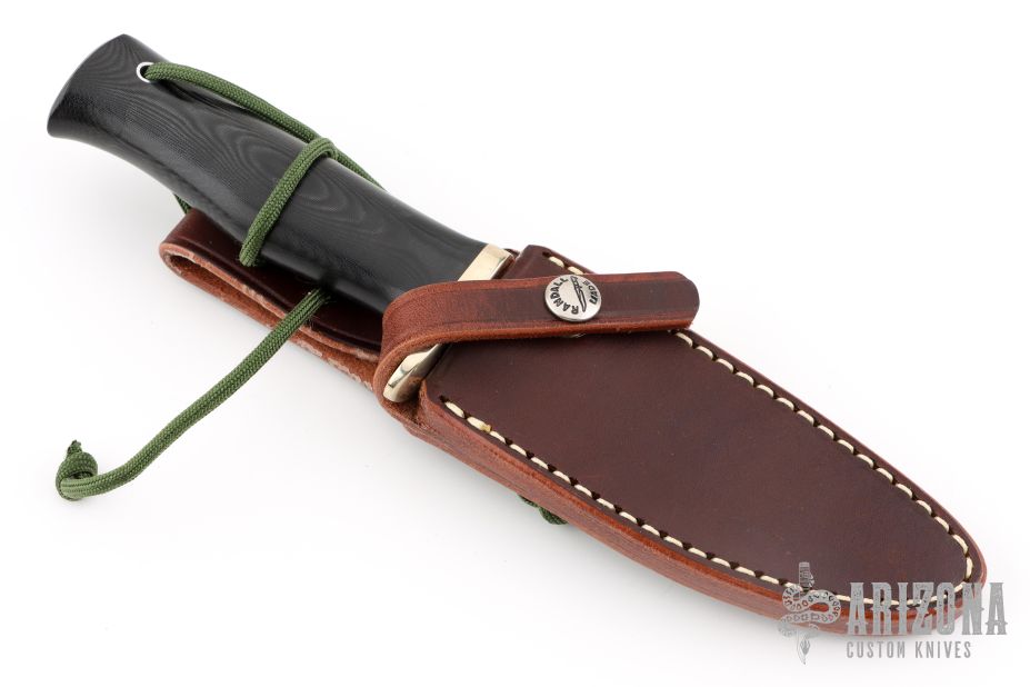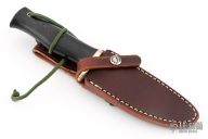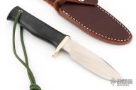 The Model 28 by Randall Made Knives is an excellent skinning and outdoors knife. Has a satin finished drop point blade with false top edge and notched thumbrest, stainless steel blade, .176" blade stock and 1.133" blade depth, full tang construction. The handle has a nickel silver guard, black linen micarta handle and a lanyard hole at the butt. Comes with brown leather sheath. New condition.