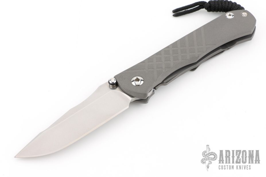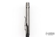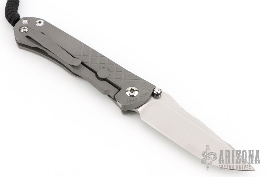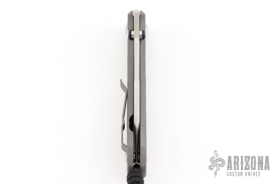 This Unumzaan from Chris Reeve Knives features a stonewash finish blade with dual thumb studs and notched thumbrest. The handle has a bead blasted and milled titanium with matching tip up clip. Lanyard pin with lanyard and spacer bead in pommel. Comes with original box, tools and papers dated April 10, 2025. New condition.