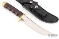 This model 4-6 from Randall Made Knives has an upswept satin finished blade with false top edge, .228" blade stock and 1.1114" blade depth, hidden tang construction. The handle a brass guard, finger groove maroon linen micarta grip, black and brass spacers. Includes black leather sheath. New condition.