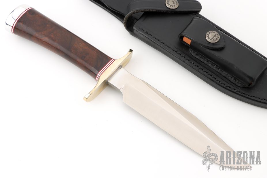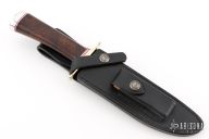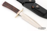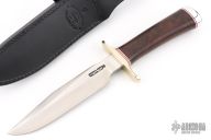 The Model 1 was made famous by Allied combat troops in World War II and has since been widely used in all theaters of war. It has a satin finished blade with sharpened top edge, .187" blade stock and 1.179" blade depth, hidden tang construction. The handle has a nickel silver guard and duralumin butt, desert ironwood grip with red/duralumin spacers. Includes a black leather sheath. New condition.