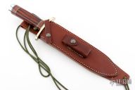The Model 12 was made to meet the demand for a heavy-duty sporting knife of the Bowie type. This non-catalog version has a Model 14 grind. This knife has a 9" stainless steel blade with sharpened top edge, .219" blade stock and 1.614" blade depth, hidden tang construction. The handle has a forward curved nickel silver guard and duralumin butt, ironwood grip with black/duralumin/stacked leather spacers. Includes a brown leather sheath. New condition.