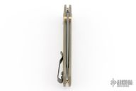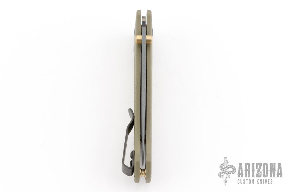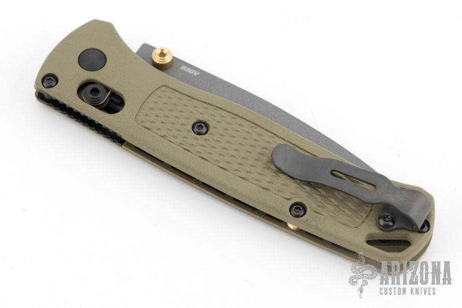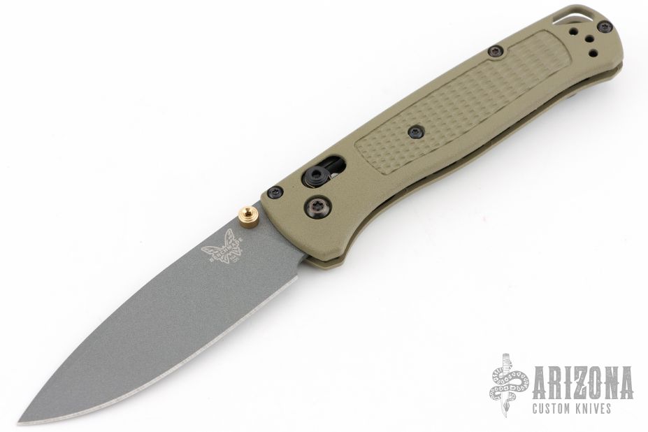 The Benchmade Bugout features a drop point blade with a grey Cerakote finish. It's a manual opener with ambidextrous thumb studs. This AXIS lock has an OD handles with brass spacers and black hardware, a black mini deep-carry pocket clip, and a lanyard hole.  Includes original box, pouch and papers. Excellent condition.