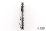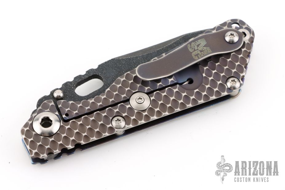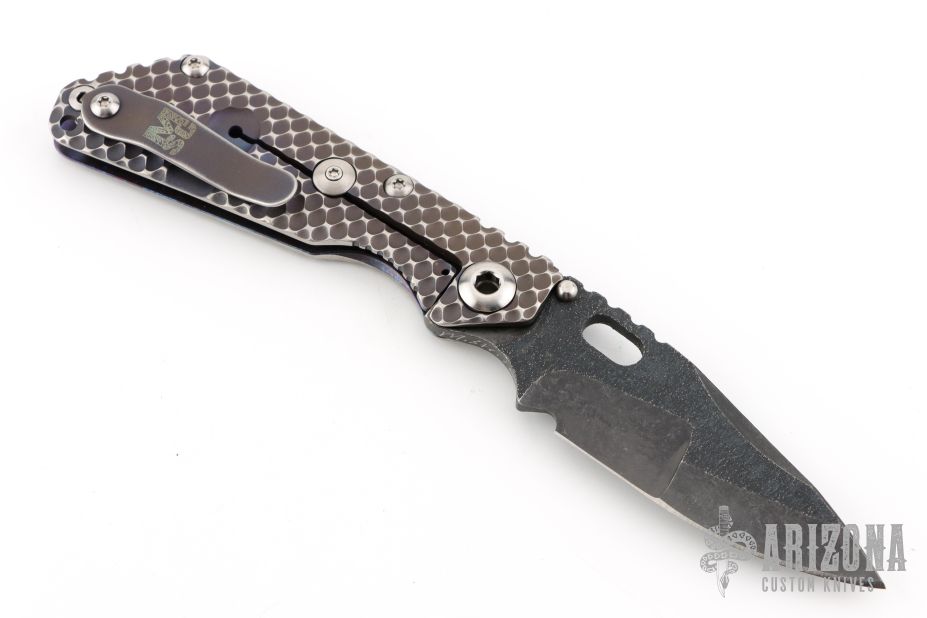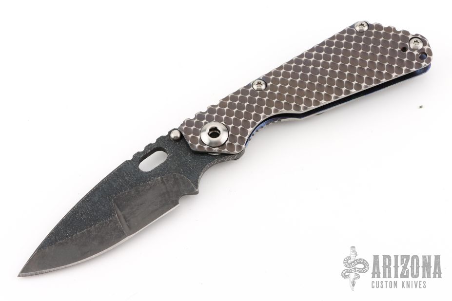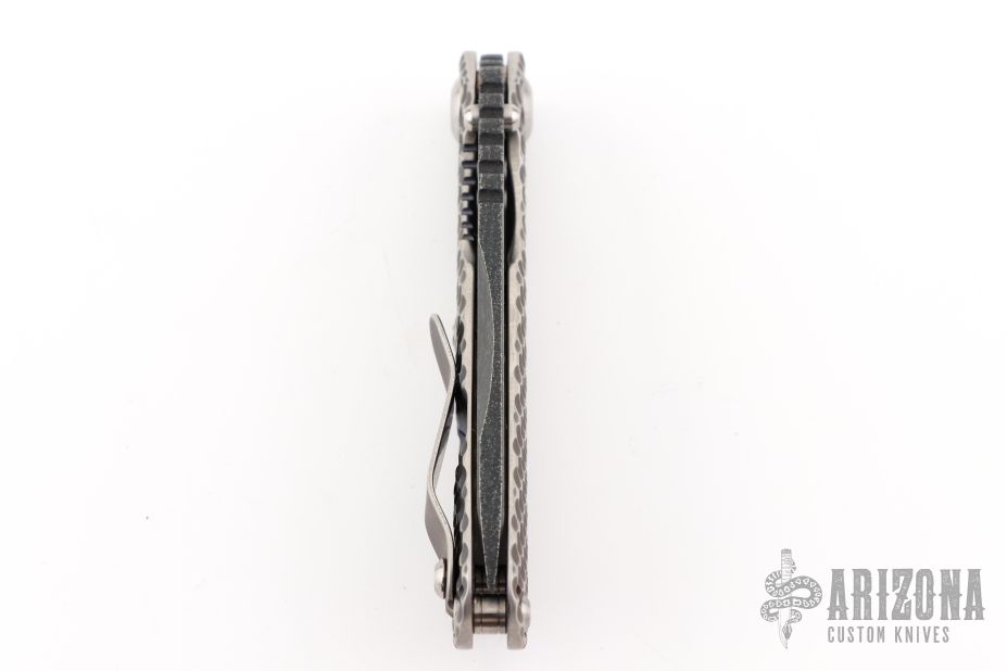 This SNG framelock folder by Mick Strider features a stonewashed Nightmare Ground blade and a dimple pattern titanium frame and tip up titanium clip. Includes a "Lock Bar Stabilizer" for maximum reverse lock retention. Nice detent, lockup and blade seating. Comes in SOE zipper case. Signed in the finger choil. Excellent condition.
