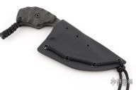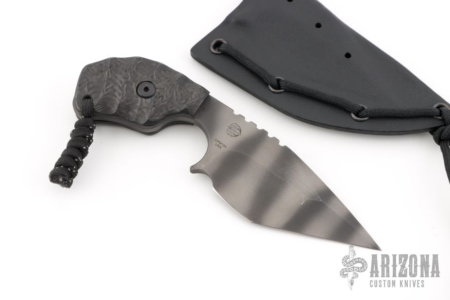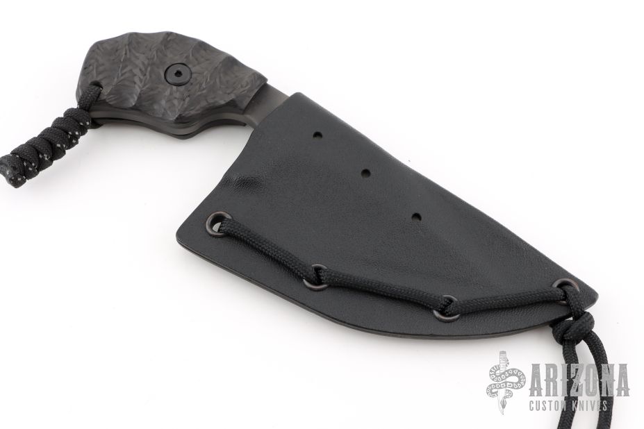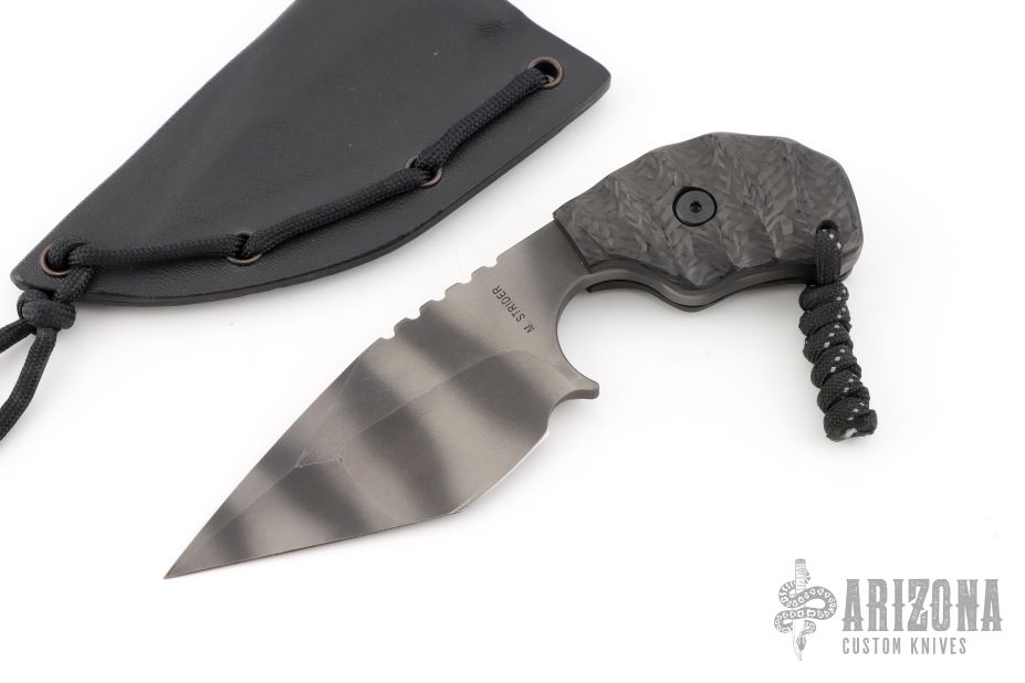 This SLCC by Mick Strider features a tiger stripe nightmare ground tanto blade with notched thumbrest, .212" blade stock and 1.589" blade depth, full tang construction. Sculpted carbon fiber covers. Comes with a kydex sheath. Has a couple light scuffs, excellent condition otherwise.