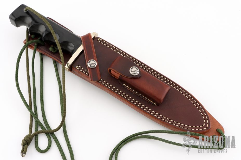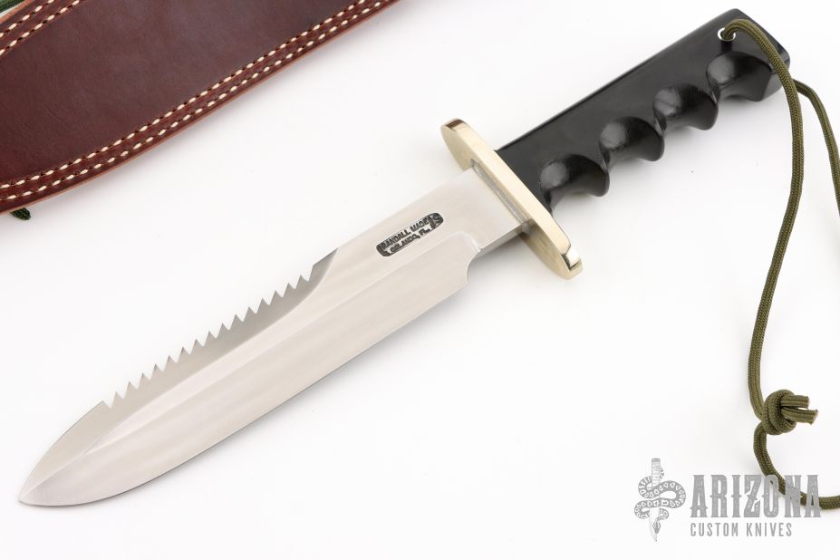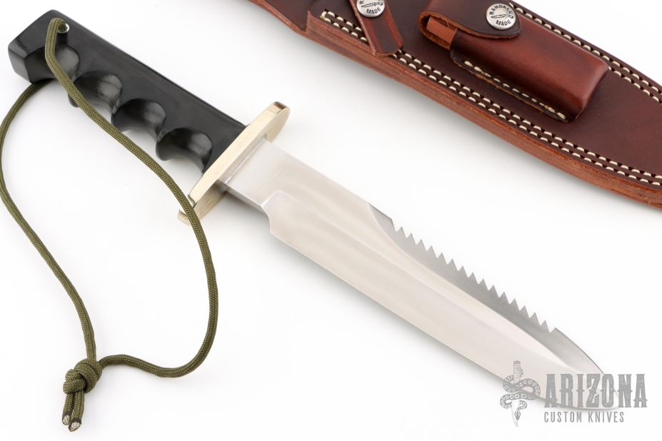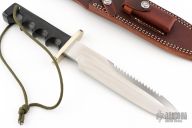 This Model 14 from Randall Made Knives features a satin finished spear point blade with sharpened top edge and sawteeth, .240" blade stock and 1.466" blade depth, full tang construction. The handle has a nickel silver guard and black linen micarta finger groove handle. Comes with brown leather sheath. Excellent condition.
