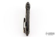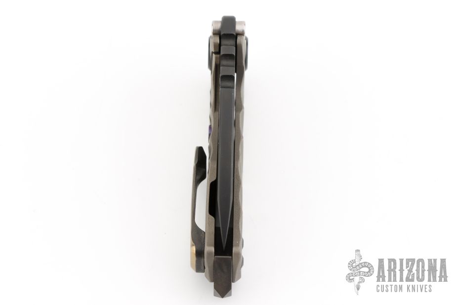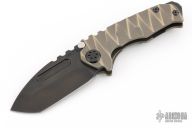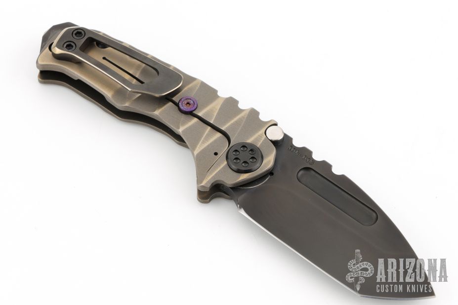 This Micro Praetorian from Medford Knife and Tool features a PVD finished blade with notched thumbrest and fullers. The handle has a carved and anodize finish titanium frame with black PVD stainless steel backspacer doubles as a glass breaker, tumbled titanium clip. Comes with a Medford box, hard case, and papers. Excellent condition.