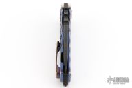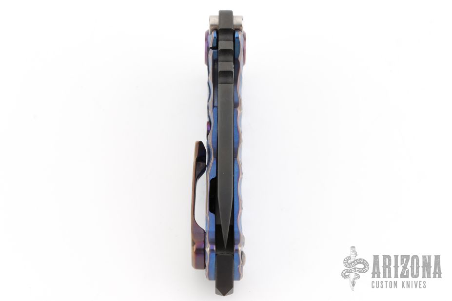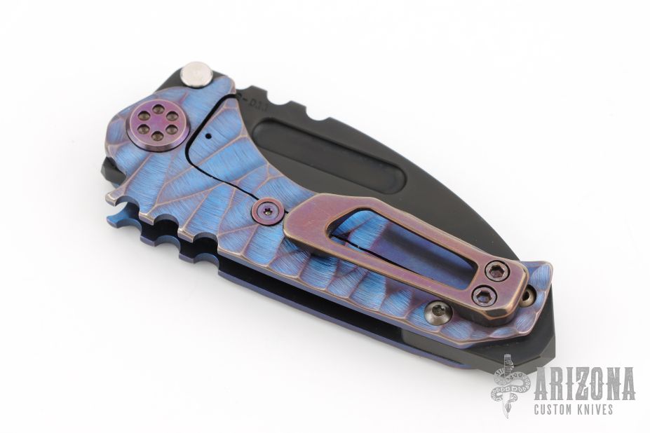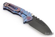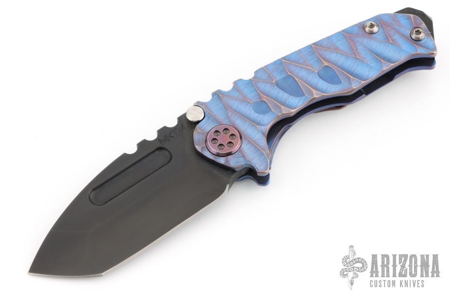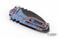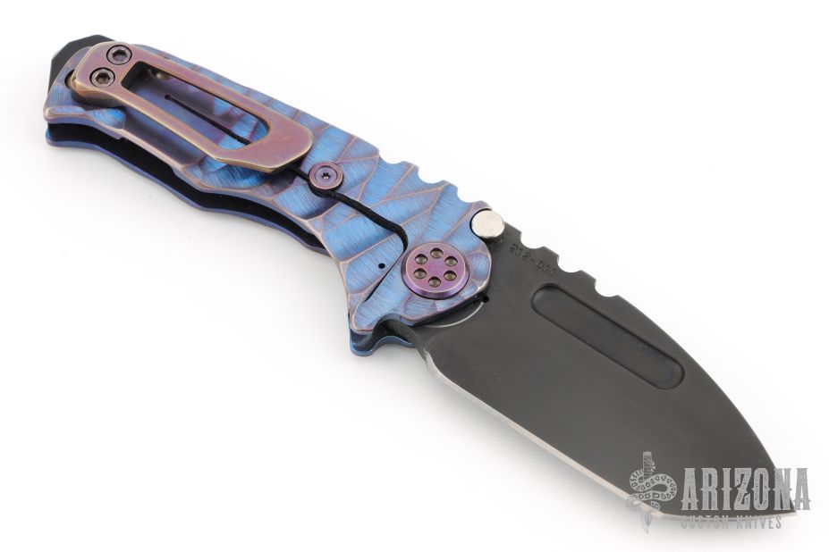 This Micro Praetorian T from Medford Knife and Tool features a PVD finished blade with notched thumbrest and fullers. The handle has a carved and anodize finish titanium frame with black PVD stainless steel backspacer doubles as a glass breaker, tumbled titanium clip. Comes with a Medford box, hard case, and papers. Has a couple light scuffs, otherwise Excellent condition.