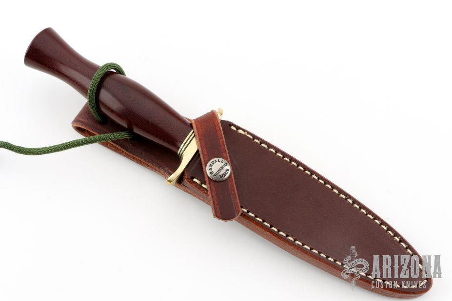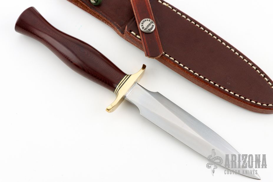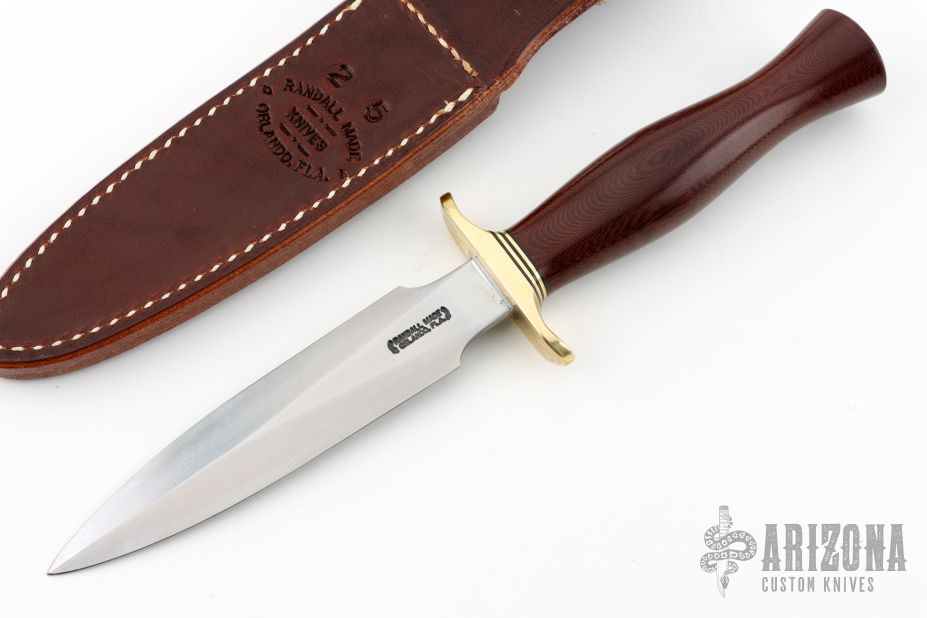 This Model 2-5 Dagger by Randall Made Knives features a double-edged satin finished blade with .145" stock and 1.37" blade depth, hidden tang construction. The handle has a brass guard with black/brass spacers and a maroon linen micarta grip. Comes with a brown leather sheath. New from maker.