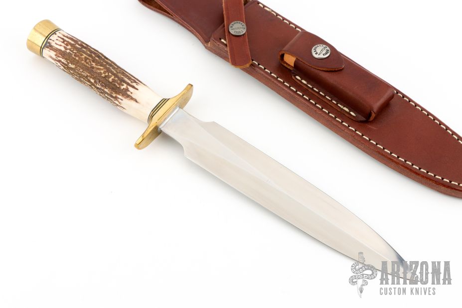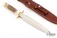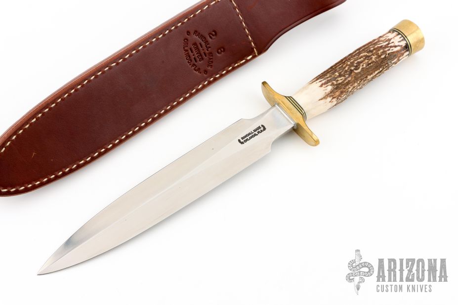 The Model 2-8 by Randall Made Knives is a heavily made dagger or dirk. The handle has a brass guard, stag grip, brass butt, black/brass spacers. Double-edged satin finished blade, .199" blade stock and 1.364" blade depth, hidden tang construction. Comes with a brown leather sheath. New from maker.