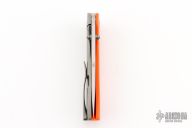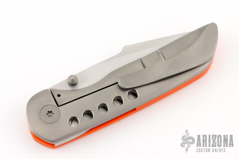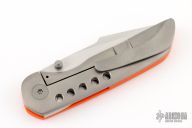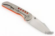 This P1 Framelock Flipper by Edward R. Knives features a hand rub satin finished clip point tanto blade with dual thumbstuds. The handle has a bead blasted titanium frame, Orange G10 showside and backspacer, tip up titanium clip. Rides on bearings, nice detent, lockup and blade seating. Comes with zippered case and COA dated January 2025. Excellent condition.