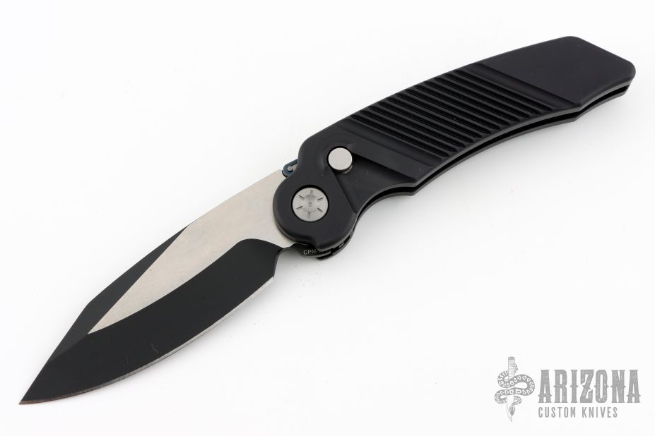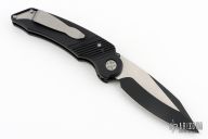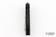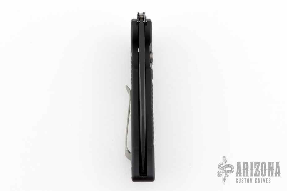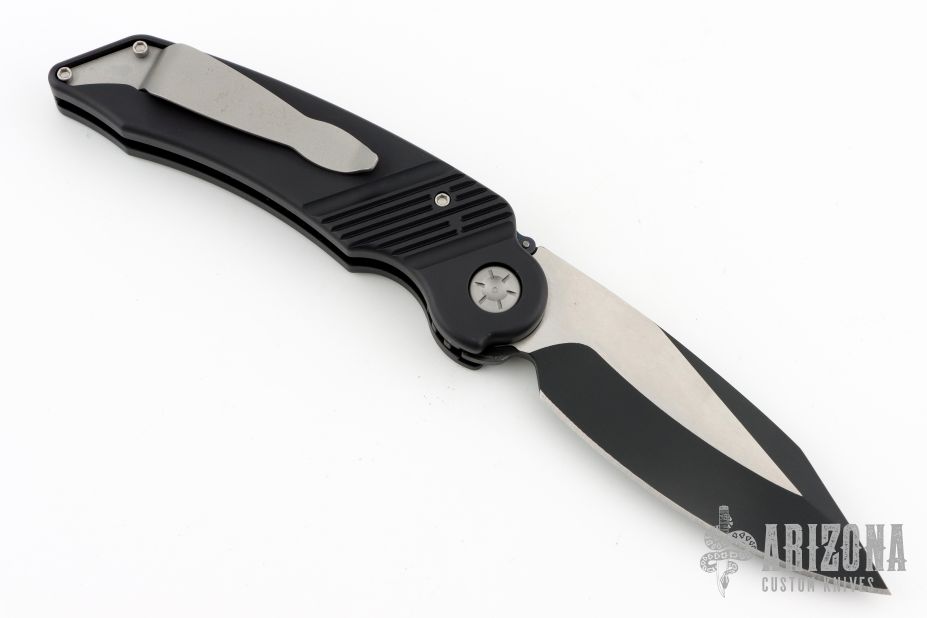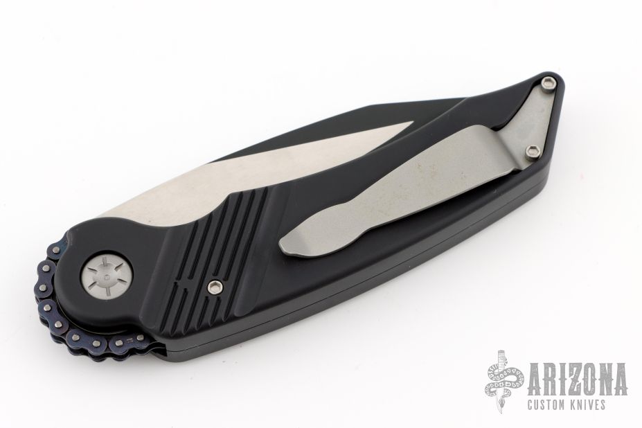 This MRX by Rat Worx features a black drop point blade. The handle is black aluminum with a chain drive opening mechanism. Tip up bead blast finished stainless clip. Comes with original zippered case. Excellent condition.